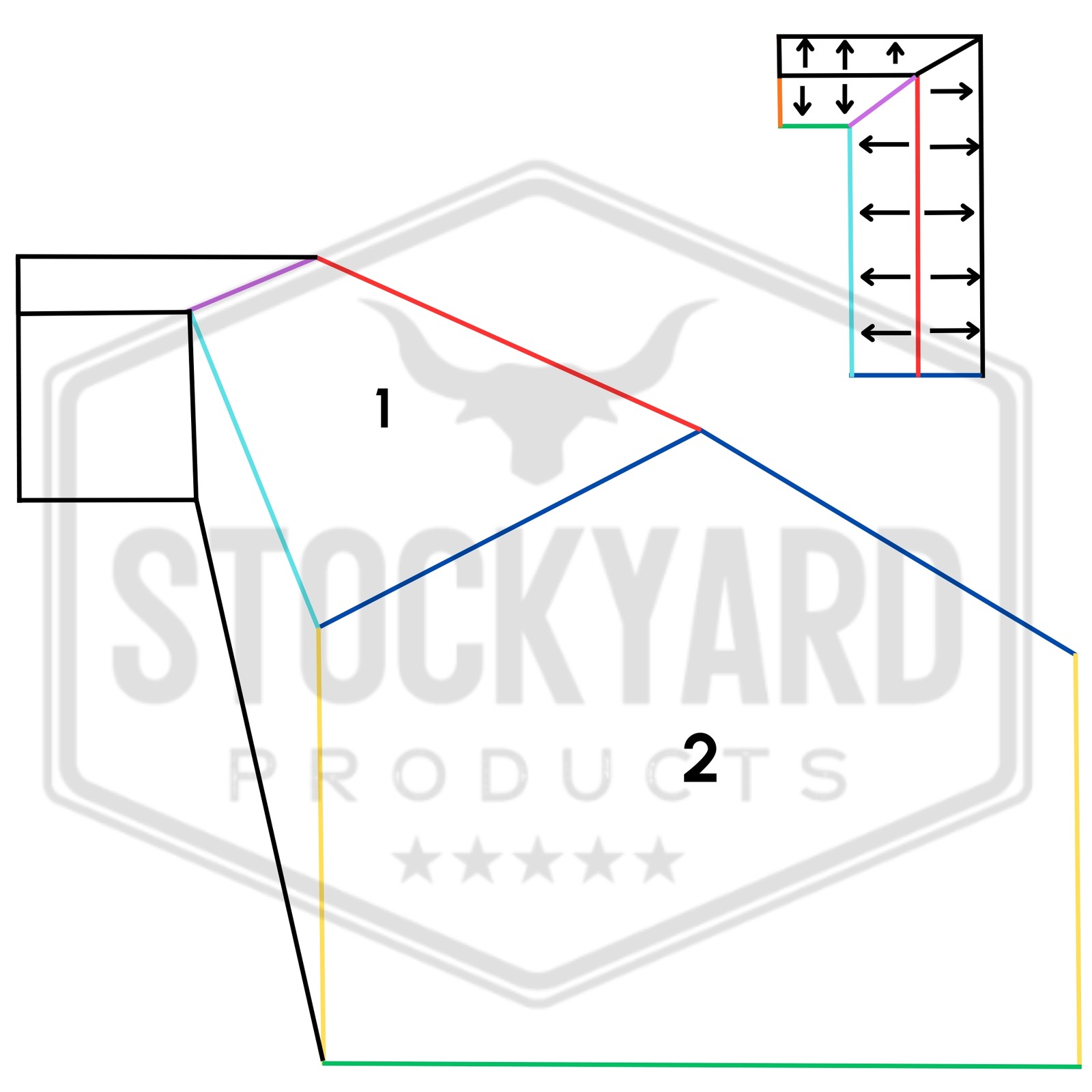 However, as you can see in the diagram's bird's eye view, the red line (ridge line) is longer. In this case, we will use the red to calculate how many sheets are needed - lets say its 40' - so we will need 14 sheets.